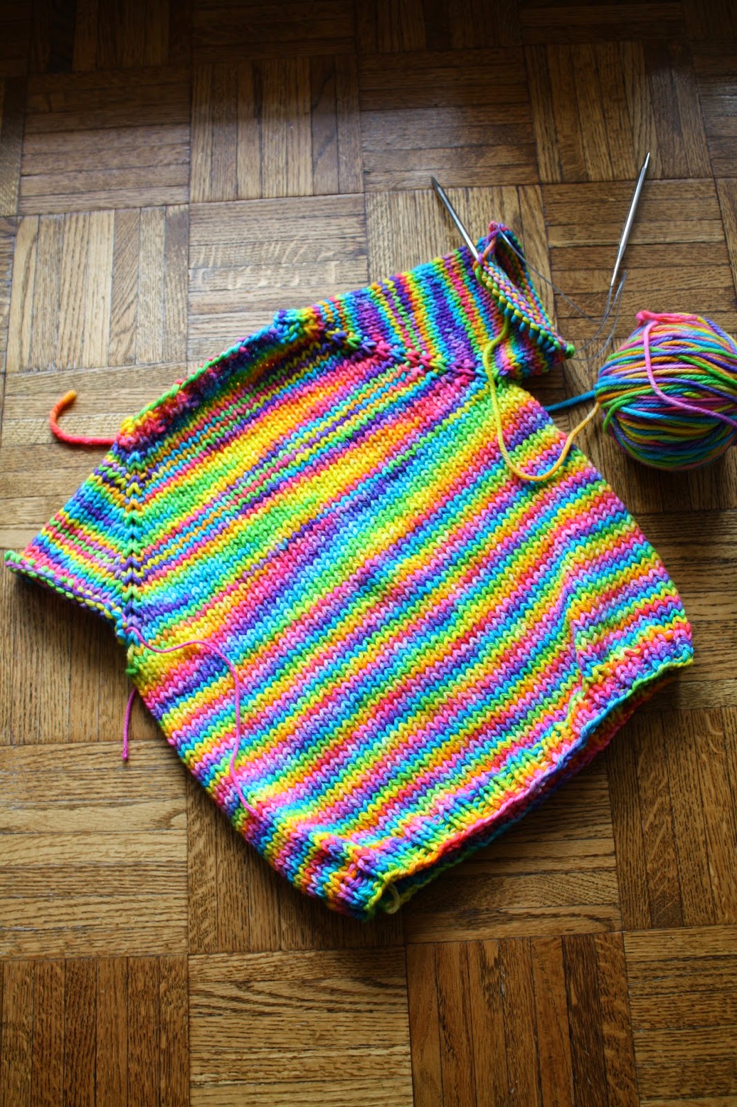 Do you remember my experiment with Easter egg dye? I'm loving how this is actually knitting up! I'm making my daughter a "rainbow raglan" using one of Ann Budd's gauge-based formula pattern books. I had a few false starts--the neckline instructions gave me some fits at first! First time it was user error--I didn't pay attention to see that there was "at the same time" neckline shaping. Second time, it was fit--the neckline was huuuuge! So I just measured a shirt, and used some quick math to come up with the right cast-on for a 13-inch circumference neckline. Perfect! This should be finished pretty quickly--gotta love bulky weight yarn!